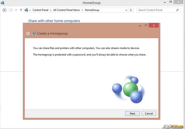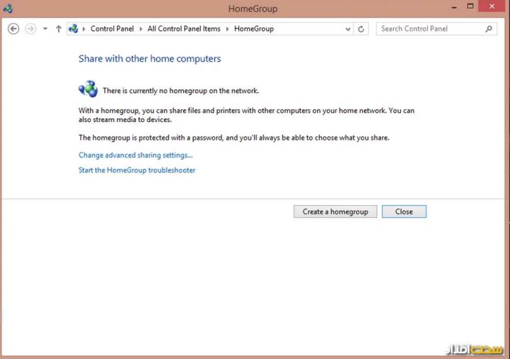 جهت اشتراکگذاری اطلاعات و فایلها بین لپتاپ (PC1) و دسکتاپ (PC2)، باید تنظیمات Home group در هر دو سیستم بهدرستی اعمال شود درصورتیکه پیکربندی بهدرستی انجام نشود، شبکه بهدرستی کارنکرده و حتی ممکن است بهصورت یکطرفه عمل کند. همچنین قبل از هر چیز دستگاههای مورداستفاده خود را به شبکه متصل کنید تا مشکلی در شناسایی و اتصال به دستگاههای دیگر وجود نداشته باشد. برای وارد شدن به تنظیمات Home Group وارد کنترل پنل شده و گزینه Home Group را انتخاب کنید. درصورتیکه هنوز Home Group در سیستم ایجاد نشده است، گزینه Create Home Group زده شود (تصویر10).