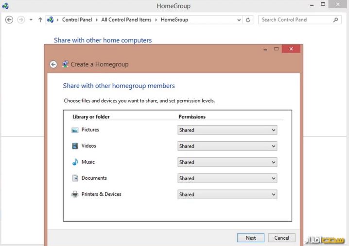 در صفحهنمایش دادهشده گزینه Next را بزنید (تصویر 11) و در صفحه بعد مواردی که میخواهید روی شبکه به اشتراک گذاشته شوند را در حالت Shared قرار داده و سپس روی Next کلیک کنید (تصویر 12).