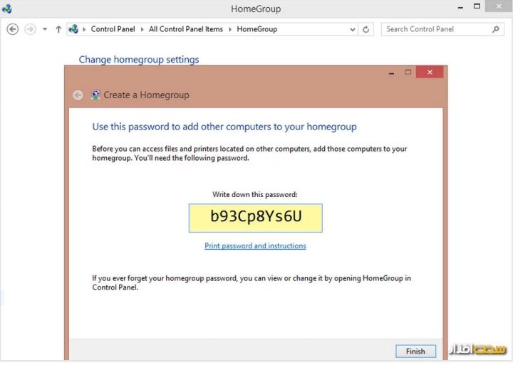 سپس Home Group یک کلمه عبور بهصورت تصادفی در اختیار شما قرار میدهد که بهتر است آن را درجایی یادداشت و سپس گزینه Finish را انتخاب کنید. با استفاده از این کلمه عبور میتوان Home Group سیستمهای دیگر را که در شبکه حضور دارند به این سیستم (PC1) است متصل کرد. (تصویر 13).