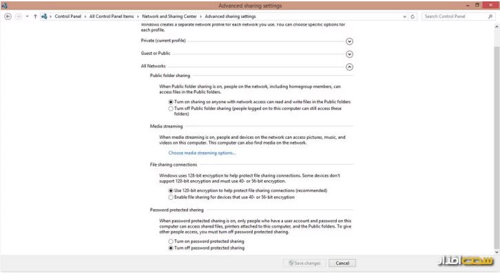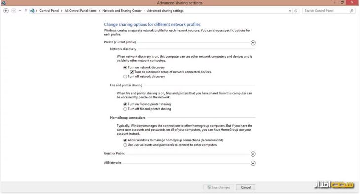 هم در قسمت Current Profile و همGuest or Public پارامترNetwork Discovery فعال است (البته برای امنیت بیشتر میتوانید قسمت Guest or Public را فعال نکنید). گزینه Turn on File and Printer Sharing جهت به اشتراکگذاری فایلها و پرینتر و پارامتر Home Group Connections طبق تصویر تنظیم شود.در بخش All Networks، درصورتیکه نخواهید با هر بار دسترسی به موارد به اشتراک گذاشتهشده به واردکردن کلمه عبور نیاز پیدا کنید، در قسمت Password Protected Sharing، گزینه Turn off Password Protected Sharing را انتخاب کنید. در سیستم دسکتاپ نیز دقیقاً همین تنظیمات در Home group اعمال میشود (تصویر 19).