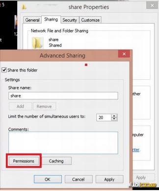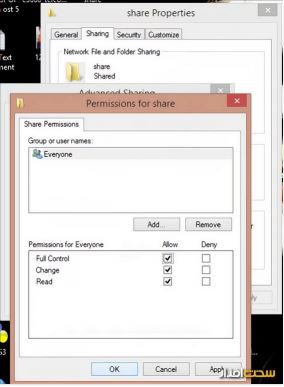 سپس گزینه Permissions را برای تعیین مجوزهای دسترسی به فولدر انتخاب و گزینه Full Control را روی Everyone تنظیم کنید (تصویر 21).