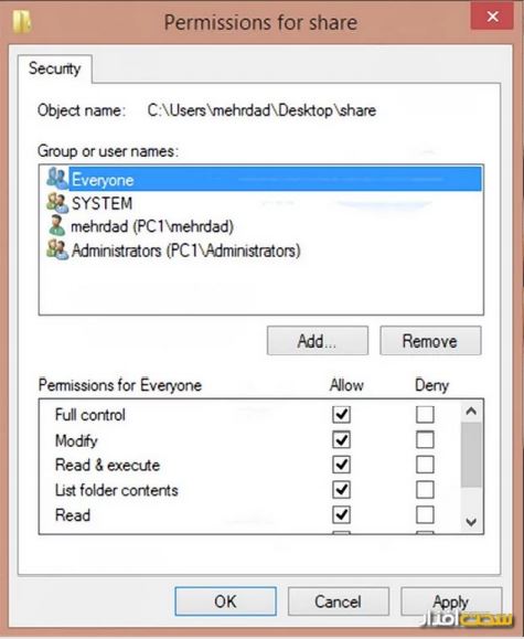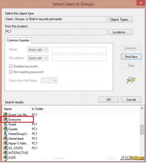 حال باید روی فولدری که ساختهاید راست کلیک کرده Properties را زده و به تب Security رفته گزینه Edit را انتخاب کنید. گزینه Add را کلیک کرده سپس گزینه Advance و بعد از آن گزینه Find now را انتخاب کنید. از بین موارد نمایش دادهشده در بخش Users، Every One را انتخاب کرده و Full control را به آن اختصاص دهید. در این قسمت برای امنیت بیشتر میتوانید کاربر Guest یا کاربران دیگر را با میزان دسترسی کمتر انتخاب کنید یا میتوانید میزان دسترسیهای Every One را محدودتر کنید (تصویر 22 و 23).