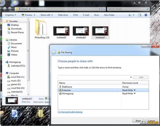 به سیستم PC1 دسترسی پیدا کند. همچنین کاربر PC1 میتواند از طریق دو روش ذکرشده فولدر Share2 در سیستم PC2 را بازکرده و فایل موردنظر را در آن فولدر قرار دهد تا کاربر PC2 بتواند به آن دسترسی داشته باشد. (درصورتیکه نتوان اطلاعات را از فولدر به اشتراک گذاشتهشده توسط سیستم دیگر استخراج کرد، روی فایل موردنظر راست کلیک کرده گزینه Share with را زده و گزینه Specific people را انتخاب کنید. کاربر Every One را به لیست اضافه کرده و مجوز Read/Write را به آن بدهید (تصویر 29).