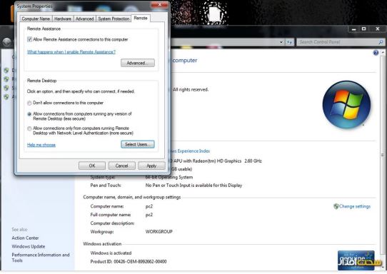 گاهی ممکن است کاربر PC2 در حال استفاده از سیستم نباشد و بخواهد اطلاعاتی را از سیستم PC2 به سیستم خودش منتقل کند. در این مواقع بهترین راه استفاده از قابلیت Remote Desktop در یک شبکه محلی است و قبل از هر چیز باید تنظیماتی را روی این سیستم اعمال کرد. برای دسترسی به این بخش از کنترل پانل گزینه System را انتخاب کرده از ستون سمت چپ گزینه Remote Setting را انتخاب کنید (تصویر 30).