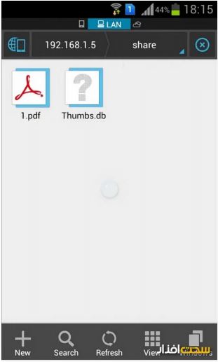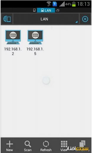 در صورتی که بخواهیم اطلاعات اشتراکی بین سیستمها در شبکه را توسط یک دستگاه اندرویدی مشاهده کنیم، به یک نرمافزار مناسب برای این کار نیاز داریم. یکی از بهترین نرمافزارها برای به اشتراکگذاری اطلاعات در دستگاههای اندرویدی، نرمافزار ES file Explorer است. بعد از نصب نرمافزار و در حالی که به شبکه Wi-Fi متصل هستید، داخل محیط نرمافزار از سربرگ بالا گزینه LAN و سپس گزینه Scan را انتخاب کنید. دستگاه سیستمهایی که در شبکه موجود هستند را جست وجو میکند و بعد از مدتزمانی دستگاهها همراه با آدرس IP شناسایی میشوند (تصویر 34).
