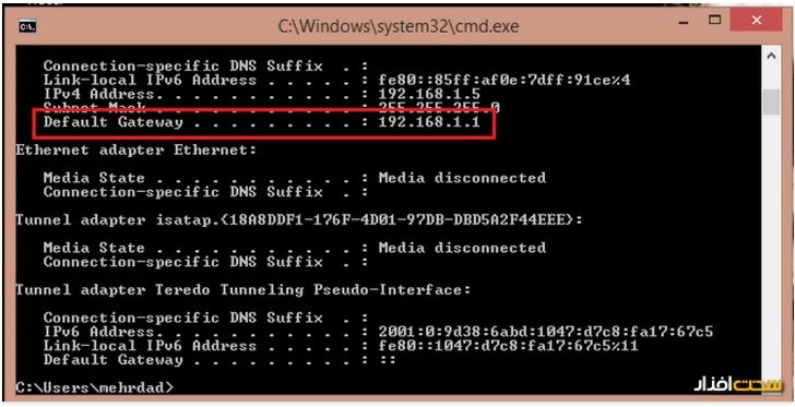 در نخستین مرحله مودم باید بهدرستی پیکربندی شود. بهاین منظور با زدن آدرس IP مربوط به مودم وارد تنظیمات مودم شوید. هر مودم ممکن است دارای آدرس IP متفاوتی باشد و در اینجا آدرس IP مربوط به مودم TP-Link 8901G برابر با 192.168.1.1 است. در صورت ندانستن آدرس مودم، میتوانید برچسب زیر مودم را مشاهده کرده یا با روشن کردن مودم و واردکردن دستور Ipconfig در محیط CMD، آن را در مفاد نوشتهشده در برابر عبارت Default Gateway Address به دست آورید (تصویر 1).