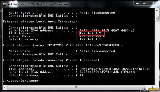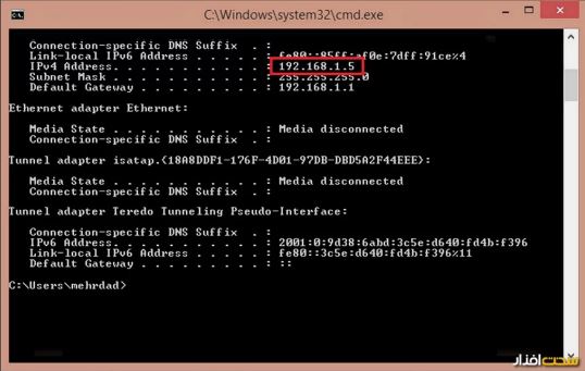 جهت ارتباط بین سیستمها و وارد شدن به سیستم دیگر لازم است IP سیستمهای متصل به شبکه را بدانیم که مودم به آنها اختصاص داده است. ازآنجاکه DHCP مودم فعال است، مودم خود با دریافت آدرس فیزیکی هر دستگاه جهت به دست آوردن یک آدرس IP، یک IP یکتا به آن اختصاص میدهد و لازم نیست بهطور دستی به دستگاههای متصل به مودم IP بدهیم. بهمنظور مشاهده IP هر دستگاه در بخش Search ویندوز هشت یا Run ویندوز هفت عبارت CMD را تایپ کرده و دستور Ipconfig را بنویسید (تصویر 24).