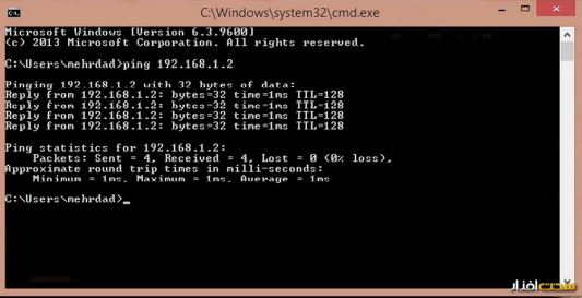 قبل از آنکه قصد داشته باشیم که اطلاعات را بین سیستمهای مختلف انتقال دهیم باید اطمینان حاصل کنید که با تنظیماتی که در سیستمها انجامشده است، آیا باهم در شبکه ارتباط دارند یا خیر. بهاینمنظور باید از تست پینگ استفاده کنیم و از اتصال سیستمها به یکدیگر اطمینان حاصل کنید. در بخش Search (در ویندوز هشت) یا Run (در ویندوز هفت) عبارت CMD را نوشته و دستور “ping ip address” را تایپ کنید. بهجای عبارت ip address مقدار IP هر سیستم را وارد کنید. برای مثال زمانی که روی سیستم PC2 مقدار IP سیستم PC1 را Ping کنید، در صورت برقراری ارتباط پیغامی نمایش داده خواهد شد (تصویر 26).